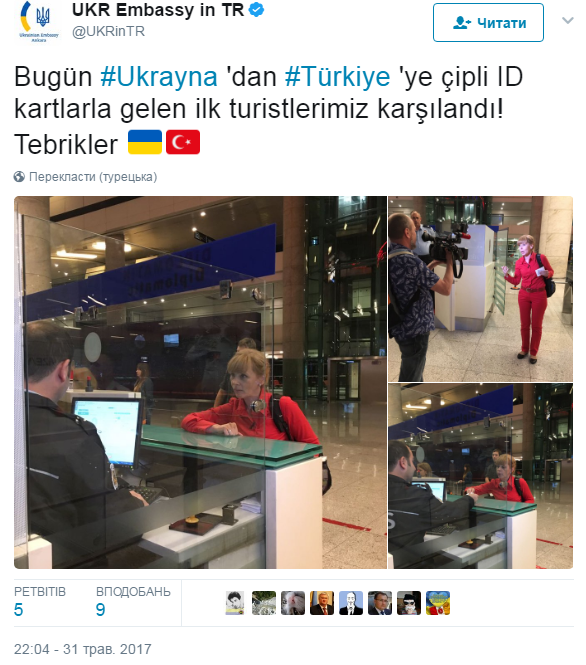 «Соглашение о взаимных поездках граждан Украины и Турции по ID-карточкам вступает в силу с 1.06.2017. Завтра встречаем первых туристов из Украины и обратно», — написал посол вчера.