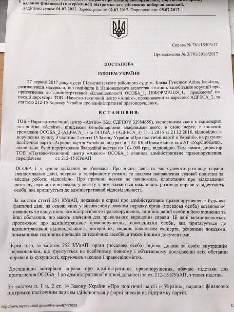 «Взносы партией были возвращены акционерному обществу, но Шевченковский райсуд Киева, рассмотрев материалы НАПК, постановил: признать директора ООО „Научно-технического центра „Алвиго““ виновным в совершении административного правонарушения (ст. 212-15 КУоАП), взыскать с него штраф 2,2 тыс. грн и конфисковать сумму вклада в поддержку Аграрной партии в размере 208 тыс. грн», — написала Корчак.