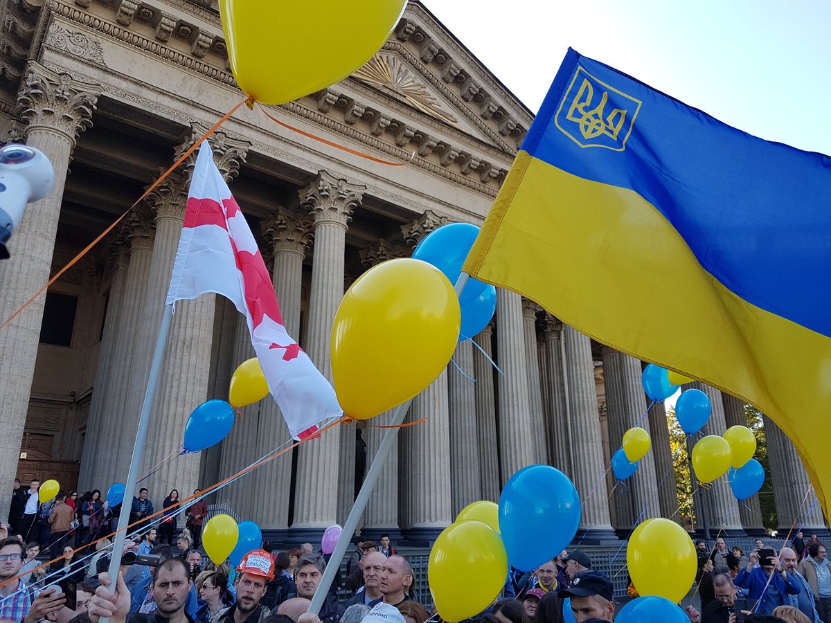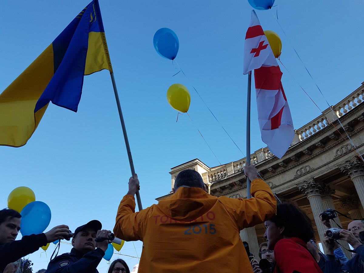 Жители Санкт-Петербурга вышли на акцию с желто-голубыми флагами, а также с шарфиками и лентами цветов украинского государственного флага. Участники митинга выкрикивали: «Слава Украине! Героям слава!».