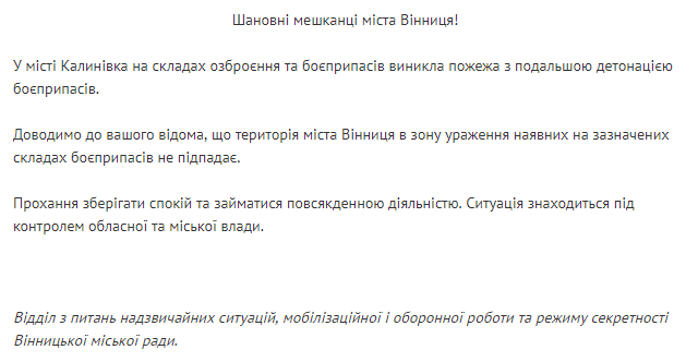 В то же время в Винницком горсовете успокоили жителей города, сообщив, что территория города Винница в зону поражения в результате взрывов в Калиновке не попадает.