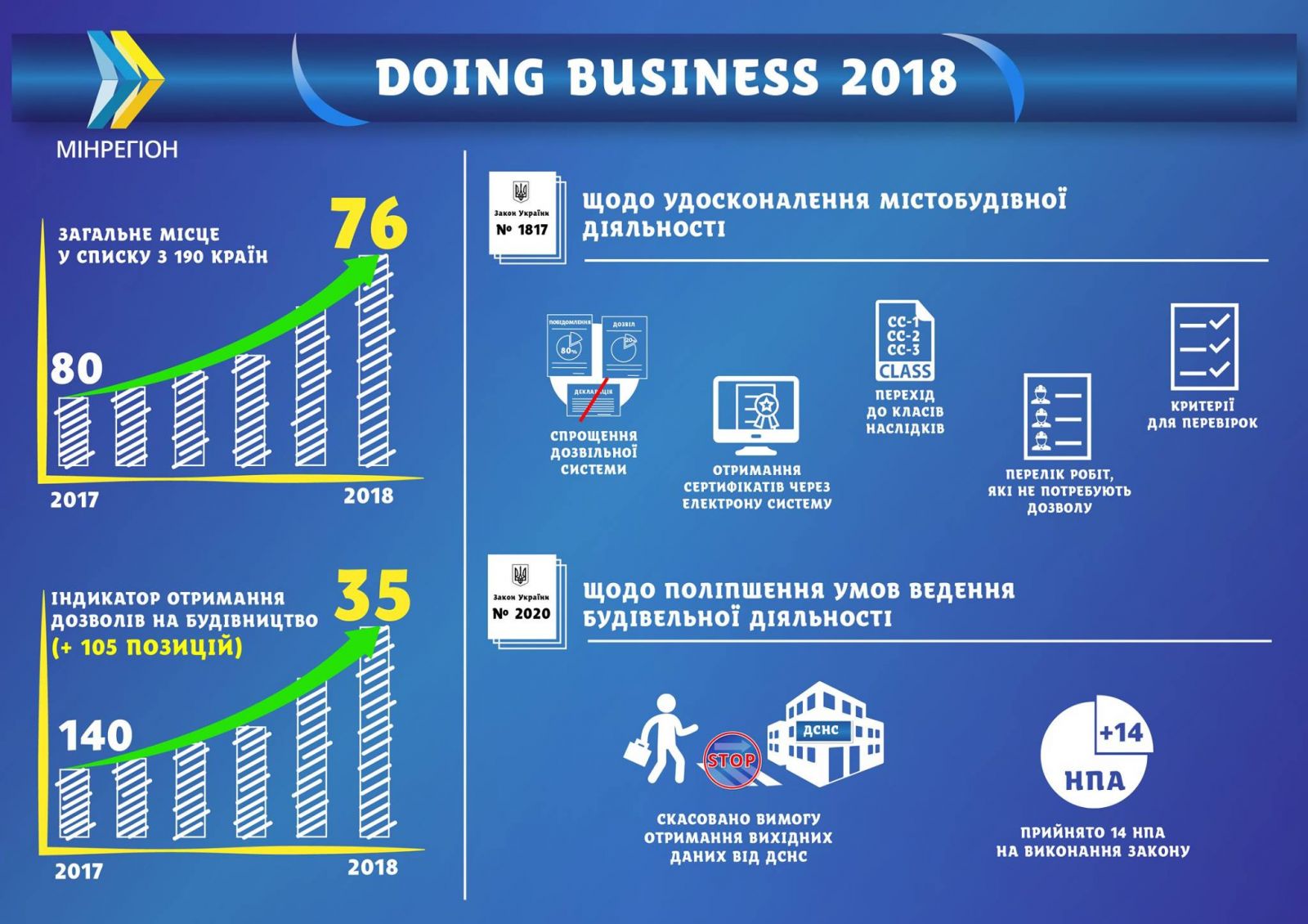 https://racurs.ua/n96438-zubko-ukraina-podnyalas-v-mirovom-reytinge-doing-business-infografika.htmlРакурсУкраина повысила свои позиции в мировом рейтинге Doing Business на 105 пунктов по показателю «Получение разрешений на строительство». Об этом сообщил на своей странице в Facebook министр регионального развития, строительства и жилищно-коммунального хозяйства Геннадий Зубко.