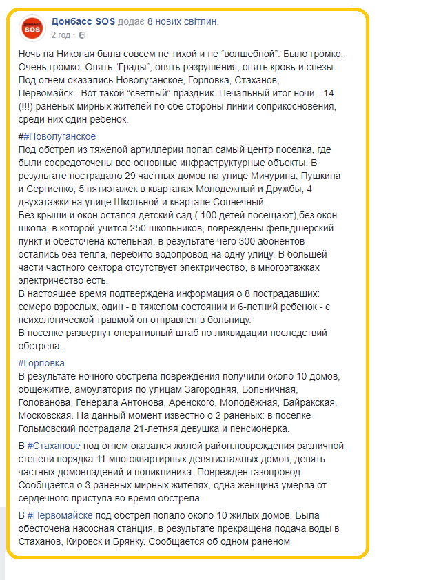 Кроме этого, волонтеры «Донбасс SOS» в Facebook заявили о том, что в результате обстрелов Новолуганского, Стаханова, Горловки и Первомайского в ночь на 19 декабря ранения получили 14 мирных жителей.