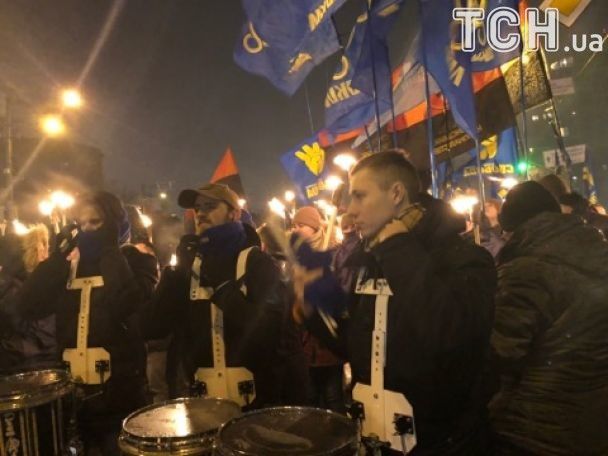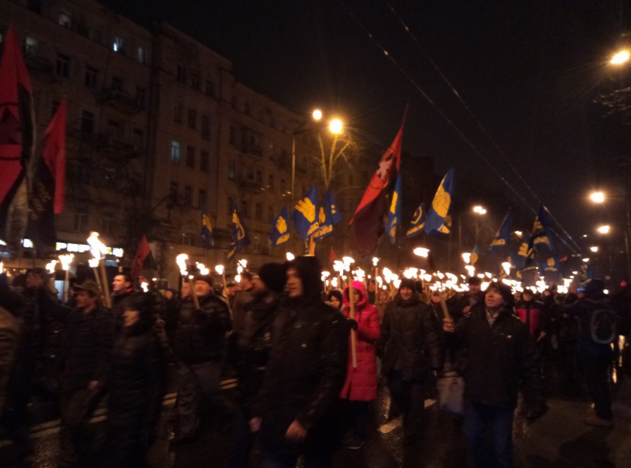 Активісти зі смолоскипами та фаєрами в руках пройшли від Арсенальної площі до Аскольдової могили. Дехто з учасників маршу тримав у руках жовто-блакитні та партійні прапори.