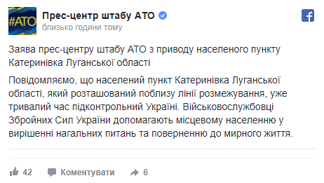 «Повідомляємо, що населений пункт Катеринівка Луганської області, розташований поблизу лінії розмежування, вже тривалий час підконтрольний Україні. Військовослужбовці ЗСУ допомагають місцевому населенню у вирішенні нагальних питань та поверненні до мирного життя», — йдеться у повідомленні штабу.