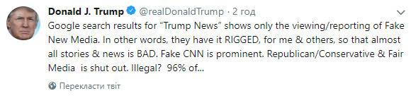 «Результати пошуку Google за запитом „Trump News“ (Новини про Трампа) демонструють виключно точку зору фейкових засобів масової інформації. Інакше кажучи, вони навмисно підбирають їх так, щоб більшість новин та згадок про мене були негативними», — написав у Twitter сам Трамп.