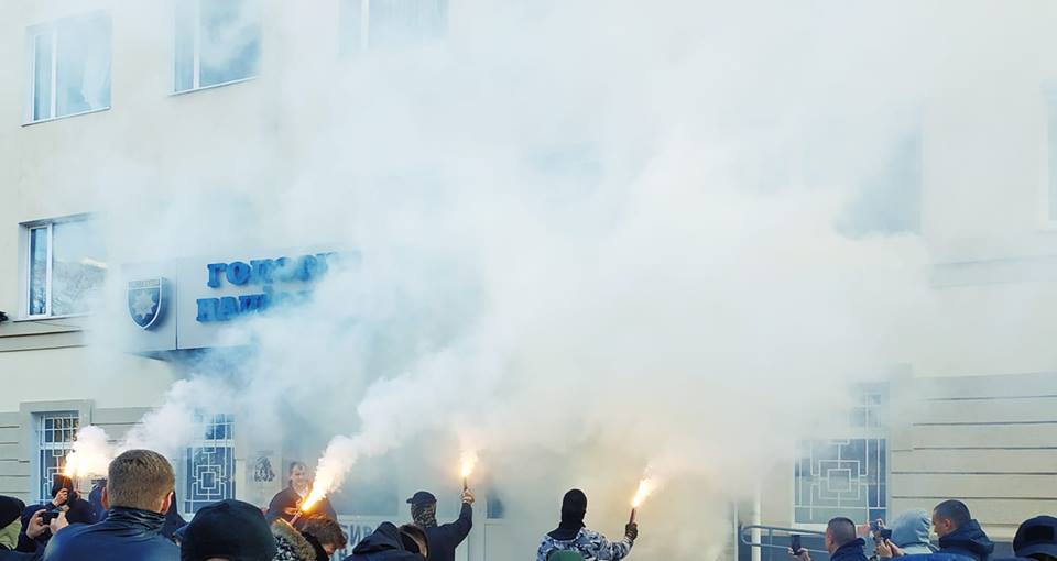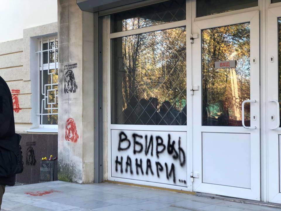 На вході в будівлю намалювали портрети вбитої активістки і написали «Вбивць на нари». Подвір’я затягнуло димом, оскільки горіли фаєри.