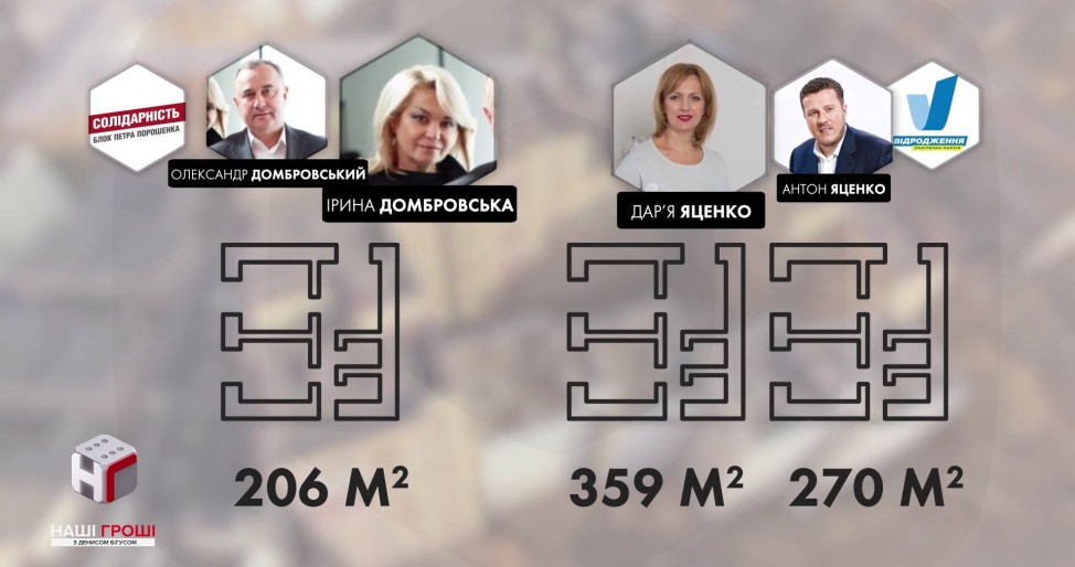 Як виявилося, квартири в цьому будинку активно скуповують родичі народних депутатів. Так, власницею квартири площею 206 кв. м стала дружина народного депутата від «Блоку Петра Порошенка» Олександра Домбровського Ірина. Два нежитлові приміщення площею 350 кв. м і 270 кв. м тепер у власності сестри депутата Антона Яценка із «Відродження» Дар’ї Яценко.