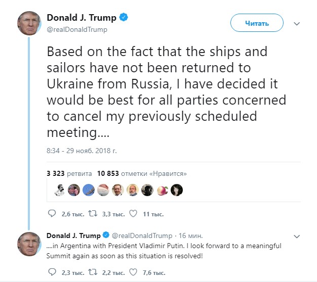 Він зазначив, що скасовує зустріч з Путіним на саміті G20 в Аргентині з огляду на те, що три кораблі ВМС України та екіпаж досі не повернуті в Україну.