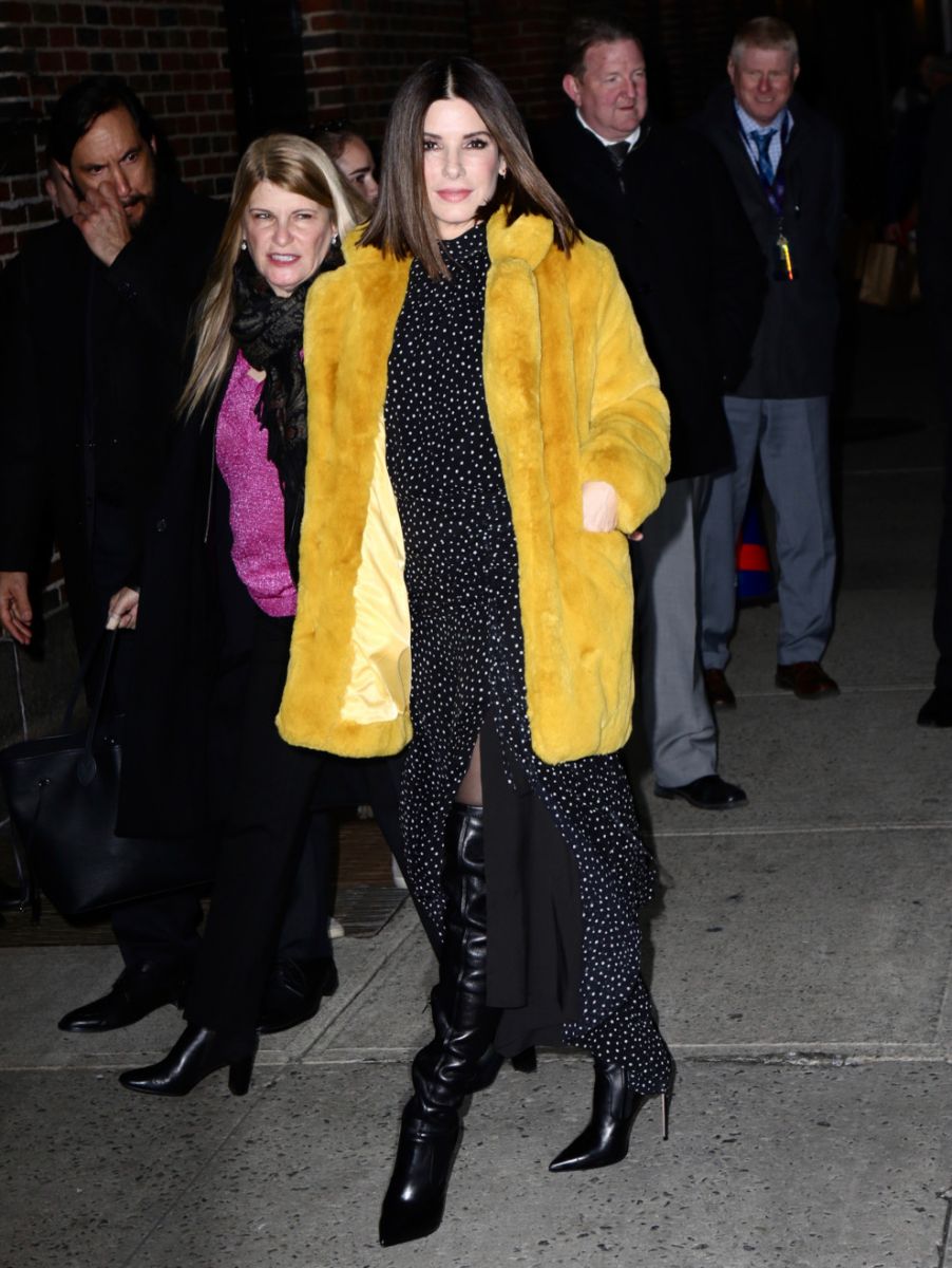 Поверх сукні Буллок хизувалася шубою зі штучного хутра жовтого кольору і чорні ботфорти на високих підборах.