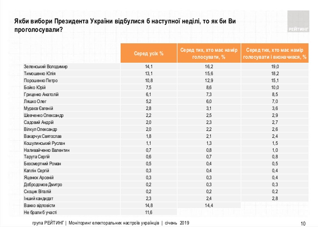https://racurs.ua/ua/n117535-prezydentskyy-reytyng-ocholyv-novyy-kandydat-tymoshenko-druga-infografika.htmlРакурсПрезидентський рейтинг очолив шоумен Володимир Зеленський, за якого на виборах у березні готові проголосувати 19% опитаних, які вже визначилися. Друге місце посідає Юлія Тимошенко з показником підтримки у 18,2%, а третє — діючий президент Петро Порошенко (15,1%). Такими є результати опитування, проведеного соціологічною групою «Рейтинг» у січні.