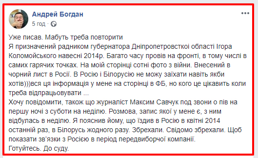 Також вона опублікувала скрін зі Facebook-сторінки Андрія Богдана.