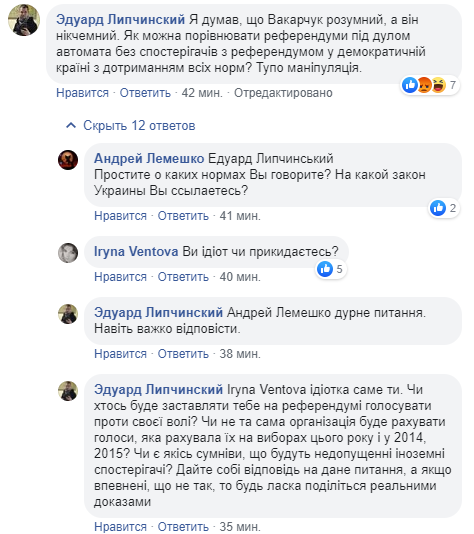 Були також ті користувачі, які обурено відреагували на слова Вакарчука та запитали, як він хоче врегулювати конфлікт з ядерною державою та які ще варіанти вирішення конфлікту, окрім мирної домовленості, він бачить.