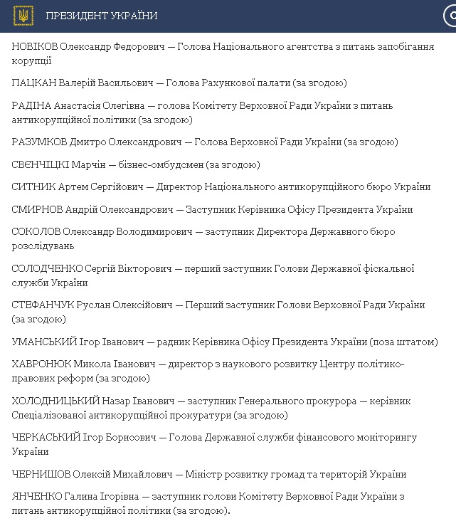 Водночас Зеленський виключив зі складу ради главу «Центру з протидії корупції» Віталія Шабуніна. Згідно з указом, тепер до складу Нацради з питань антикорупційної політики входить 31 особа.