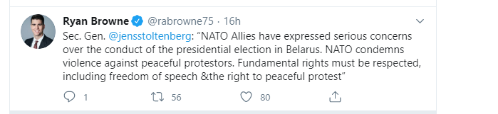 Союзники по НАТО висловили серйозну стурбованість щодо проведення президентських виборів у Білорусі. НАТО засуджує насильство проти мирних демонстрантів, — заявив генеральний секретар Північноатлантичного альянсу Єнс Столтенберг, слова якого процитував журналіст Раян Брауні у Твіттер.