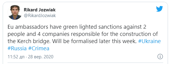 Посли ЄС дали зелене світло санкціям проти двох осіб і чотирьох компаній, відповідальних за будівництво Керченського мосту. Рішення буде офіційно оформлено пізніше цього тижня, — написав він.