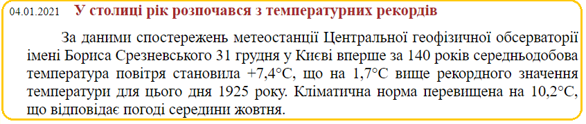 https://racurs.ua/ua/n148603-2021-rik-u-kyievi-startuvav-z-troh-temperaturnyh-rekordiv.htmlРакурсЗ температурних рекордів розпочався 2021 рік у Києві — 31 грудня у столиці вперше за 140 років середньодобова температура повітря становила +7,4°С, що перевищує попередній температурний рекорд цього дня, який було зафіксовано у 1925 році.