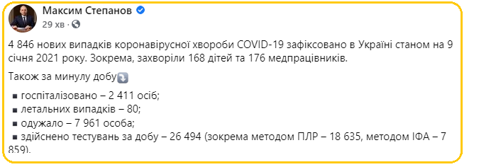 Нагадаємо, у світі станом на ранок 9 січня кількість хворих на COVID-19 становить 89,3 млн осіб. Смертність від коронавірусу сягнула 1,9 млн осіб. Найбільша кількість хворих на COVID-19 — у США (22,4 млн інфікованих). На другому місці Індія — 10,4 млн інфікованих, а на третьому — Бразилія (8 млн інфікованих).