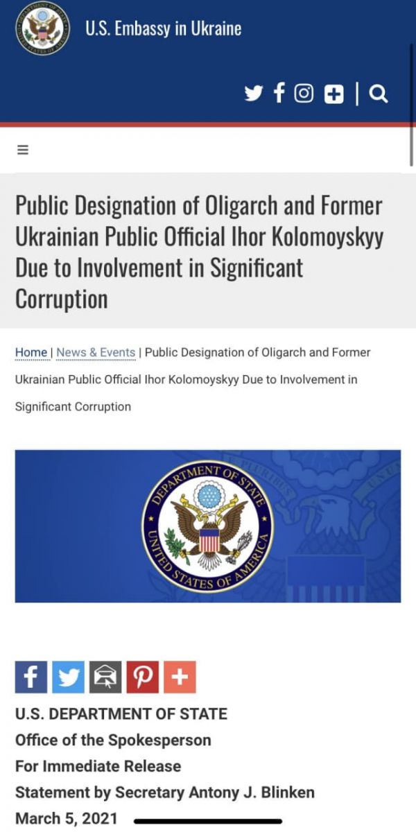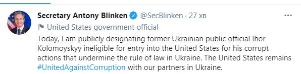 Таке рішення засноване на діях, вчинених Коломойським під час його перебування на політичної посади, я також хочу висловити стурбованість його зусиллями по підриву демократичних процесів України, — заявив держсекретар США Ентоні Блінкен.
