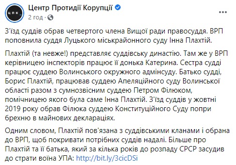Одним словом, Плахтій пов’язана з суддівськими кланами і обрана до ВРП, щоб покривати потрібних суддів надалі, — вважають у «Центрі протидії корупції».