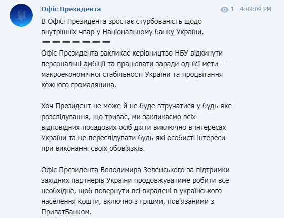 Офіс президента закликає керівництво НБУ відкинути персональні амбіції та працювати заради однієї мети — макроекономічної стабільності України та процвітання кожного громадянина. Хоч президент не може й не буде втручатися у будь-яке розслідування, що триває, ми закликаємо всіх відповідних посадових осіб діяти виключно в інтересах України та не переслідувати будь-які особисті інтереси, — наголосили у Зеленського.