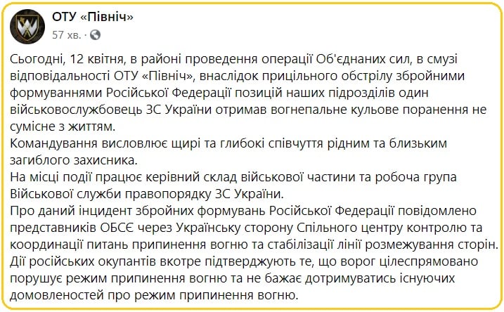 В смузі відповідальності ОТУ «Північ», внаслідок прицільного обстрілу збройними формуваннями Росії позицій наших підрозділів один військовослужбовець ЗСУ отримав не сумісне з життям вогнепальне кульове поранення, — йдеться у повідомленні.
