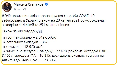 В Україні за добу 19 квітня виявили 8 тис. 940 нових випадків коронавірусної хвороби (зокрема, захворіли 414 дітей та 251 медпрацівник) й зробили 12 тис. 144 щеплення, — написав у вівторок міністр охорони здоровʼя Максим Степанов у Facebook.