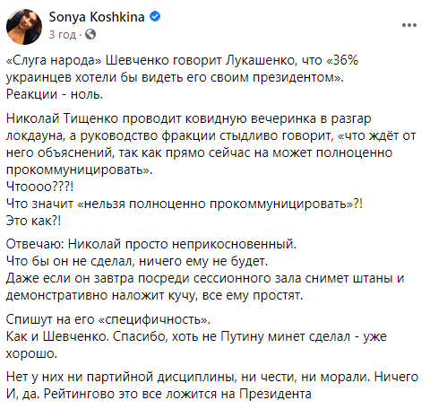 Шевченко каже Лукашенку, що «36% українців хотіли б бачити його своїм президентом». Реакції нуль. Микола Тищенко проводить ковідну вечірку в розпал локдауну, а керівництво фракції сором’язливо каже, «що чекає від нього пояснень, бо прямо зараз не може повноцінно прокомунікувати», — написала вона на своїй сторінці в Facebook.