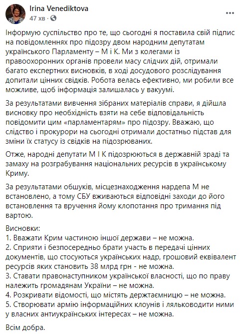 Інформую суспільство про те, що сьогодні я поставила свій підпис на повідомленнях про підозру двом народним депутатам українського парламенту — М і К. Ми з колегами із правоохоронних органів провели масу слідчих дій, отримали багато експертних висновків, в ході досудового розслідування допитали цінних свідків. Робота велась ефективно, ми робили все можливе, щоб інформація залишалась у вакуумі, — йдеться в повідомленні.