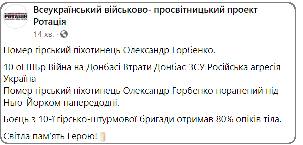 Помер гірський піхотинець Олександр Горбенко з 10-тої окремої гірсько-штурмової бригади Сухопутних військ Збройних сил України, поранений під Нью-Йорком. Боєць отримав 80% опіків тіла. Світла пам’ять Герою! — вказано у повідомленні.