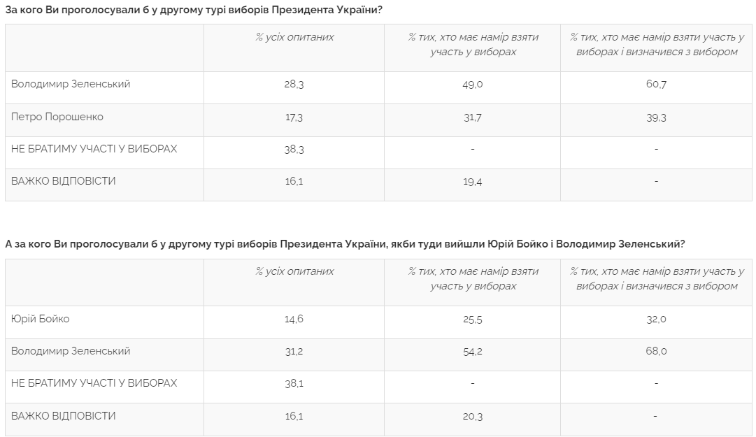 У випадку виходу до другого туру Зеленського і Бойка, за чинного главу держави проголосували б 68% респондентів, а за Бойка — 32%.
