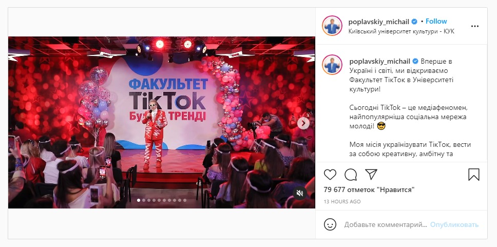 Цей навчальний заклад відкрив «перший в Україні й світі» факультет TikTok. Після його закінчення випускники отримають диплом тіктокерів. Про це заявив співак та колишній ректор вузу Михайло Поплавський на відкритті факультету, повідомляється на його сторінці в Instagram.
