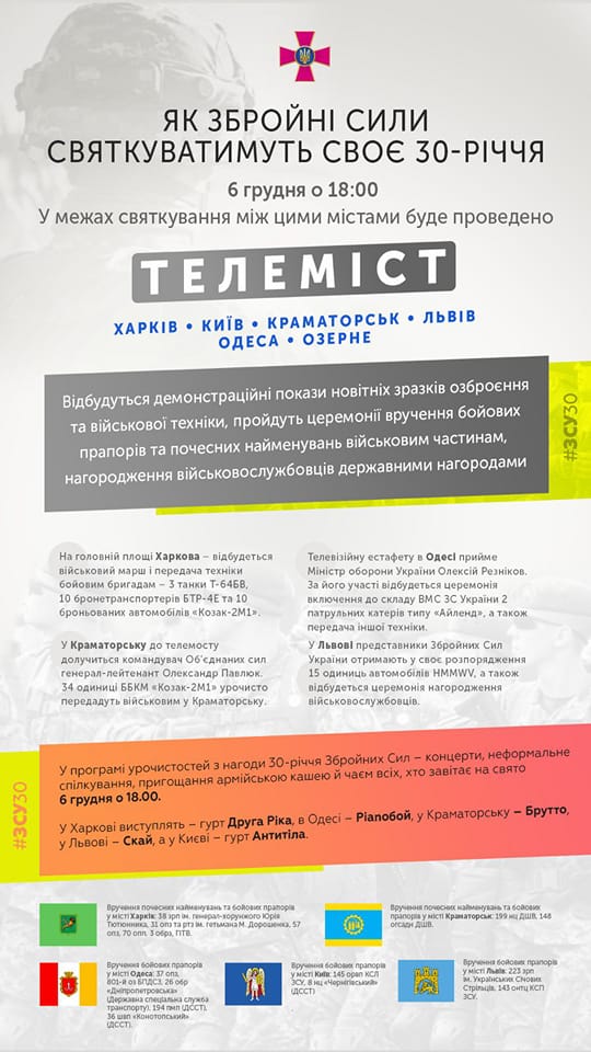 https://racurs.ua/ua/n164030-30-richchya-zsu-svyatkuvatymut-odnochasno-u-shesty-mistah-detali.htmlРакурсВ Україні завтра, 6 грудня, одночасно у шести містах відбудуться святкування з нагоди 30-річння Збройних сил.