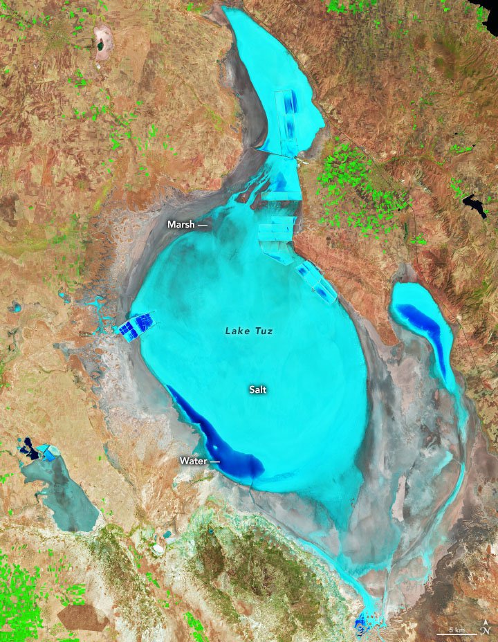 Внаслідок інтенсивних посух, які нині частіше спостерігаються в Туреччині, розміри озера Туз сильно зменшилися. Фахівці Егейського університету за допомогою знімків супутника Landsat NASA з 1985 по 2016 роки класифікували типи поверхні озера: воду (синій колір), сіль (зелений) та болото (світло-коричневий).