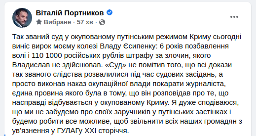 https://racurs.ua/ua/n167134-okupanty-v-krymu-zasudyly-ukrayinskogo-frilansera-za-vygotovlennya-vybuhivky.htmlРакурсВ окупованому росіянами Криму винесли вирок фрілансеру «Радіо Свобода» Владиславу Єсипенку. Він отримав від так званого «Сімферопольського райсуду» шість років колонії і штраф у 110 тис. російських рублів.
