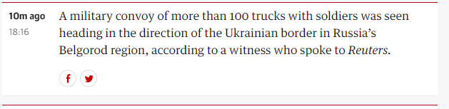https://racurs.ua/ua/n167400-viyskova-kolona-rf-zi-100-vantajivok-pryamuie-do-kordonu-ukrayiny-reuters.htmlРакурсВійськова колона РФ, до складу якої входять понад 100 вантажівок, прямує до кордону України. Цю інформацію з посиланням на очевидців повідомляють Reuters та The Guardian.