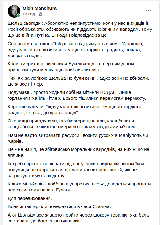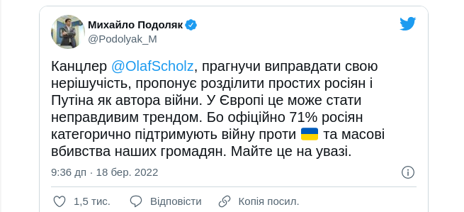 Прагнучи виправдати свою нерішучість, [він] пропонує розділити простих росіян і путіна як автора війни. У Європі це може стати неправдивим трендом. Бо офіційно 71% росіян категорично підтримують війну проти України та масові вбивства наших громадян". Перед цим Шольц заявив, що «неприпустимо ображати вихідців з росії, тому що війна рф проти України — це війна путіна, і тільки він несе відповідальність за неї, — написав Подоляк у Твіттер.