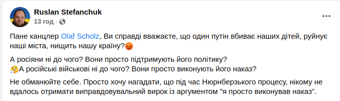 Голова Верховної Ради Руслан Стефанчук нагадав Шольцу, що під час Нюрнберзького процесу нікому не вдалось отримати виправдовувальний вирок із аргументом «я просто виконував наказ».