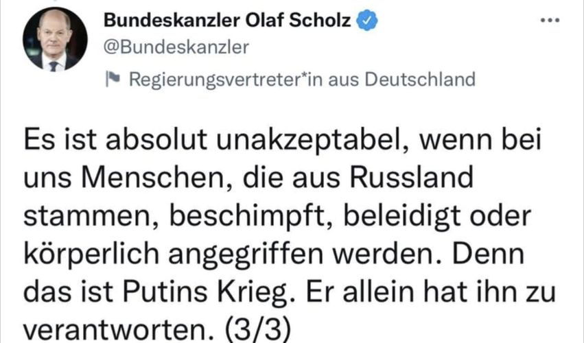 Абсолютно неприпустимо, коли у нас вихідців із Росії ображають, обзивають чи піддають фізичним нападам. Тому що це війна Путіна. Він один відповідає за це, — написав Шольц у своїх соцмережах.