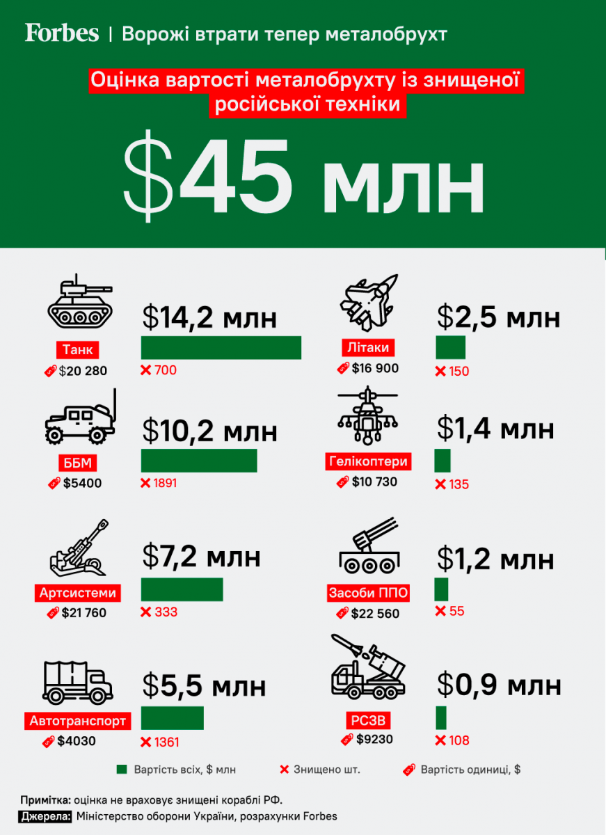 Загальна вартість усього цього брухту за ринковими цінами становитиме 45 млн дол.