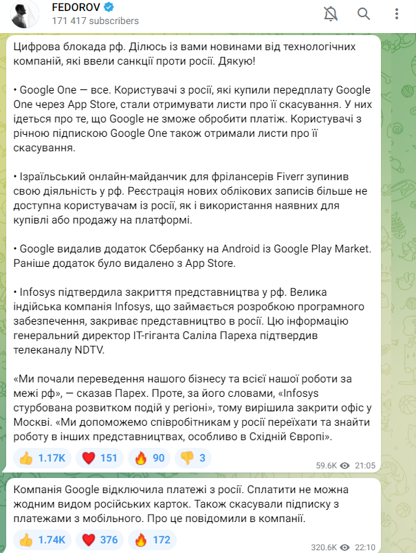 Про це з посиланням на заяву компанії повідомив міністр цифрової трансформації Михайло Федоров.