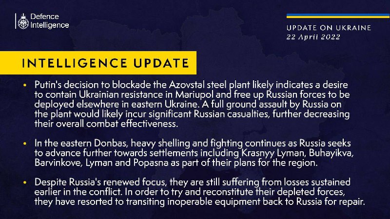 У розвідці додали, що москва продовжує нести втрати, тому намагається відновити сили та транзитом перекидає неробочу техніку назад до рф для ремонту. За даними британського відомства, рішення путіна блокувати «Азовсталь» — це бажання звільнити російські сили для розміщення в інших місцях на сході України.