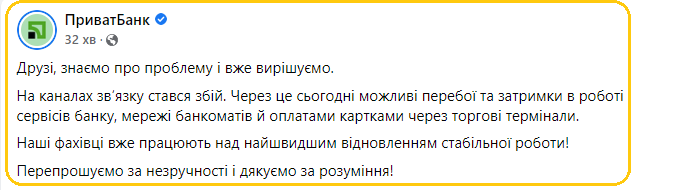 Фахівці банку роблять все можливе для найшвидшого відновлення стабільної роботи, — інформує прес-служба банку.