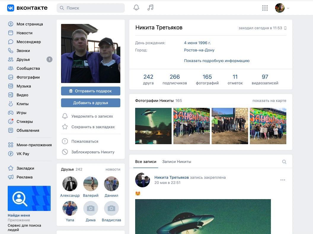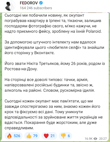 За допомогою штучного інтелекту нам вдалося ідентифікували цього «любителя селфі» та знайшли його сторінку у Вконтактє. Його звати нікіта третьяков, йому 26 років, родом із Ростова-на-Дону. На сторінці все доволі типово: тачки, армія, напіврозвалені російські будинки та, звісно ж, алкоголь на районі. Словом, рускомірна ідилія, — зауважив Федоров.