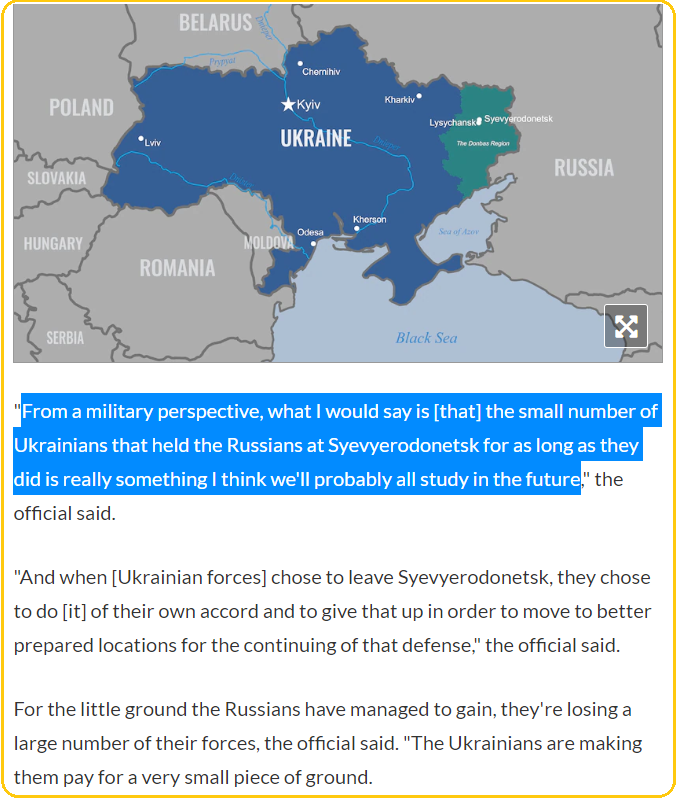 З військової точки зору, я б сказав, що невелика кількість українських солдат, які тримали росіян у Сєвєродонецьку стільки часу, — це справді те, що я вважаю, ми всі, ймовірно, вивчатимемо у майбутньому, — зазначив представник Пентагону.