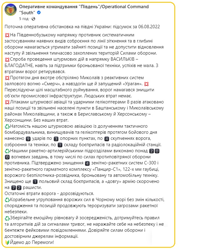 https://racurs.ua/ua/n173467-pancyr-chotyry-s-300-i-ponad-70-okupantiv-znyschyly-zsu-ok-pivden.htmlРакурсОперативне командування «Південь» розповіло про результати роботи військовослужбовців Збройних сил України станом на 7 серпня. Зокрема, штурмова авіація ЗСУ із долученням тактичного бомбардувальника, винищувачів та гелікоптерів впродовж доби завдала дев’ять ударів по трьох опорних пунктах росіян, чотирьох скупченнях ворога, складу боєприпасів та радіолокаційній станції.