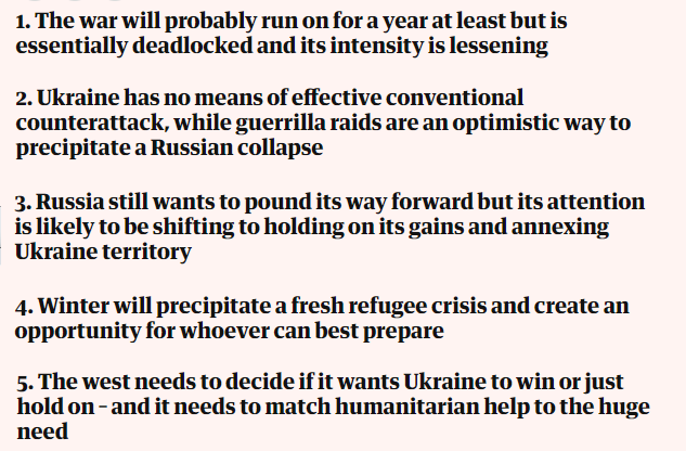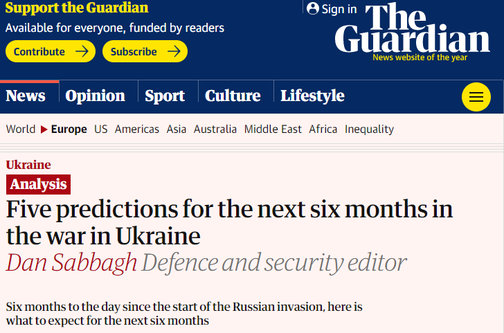 https://racurs.ua/ua/n174104-p-yat-prognoziv-rozvytku-viyny-nazvalo-vydannya-the-guardian.htmlРакурсПʼять прогнозів розвитку війни росії проти України на наступні шість місяців оприлюднив редактор розділу оборони й безпеки британського видання The Guardian Ден Саббах.
