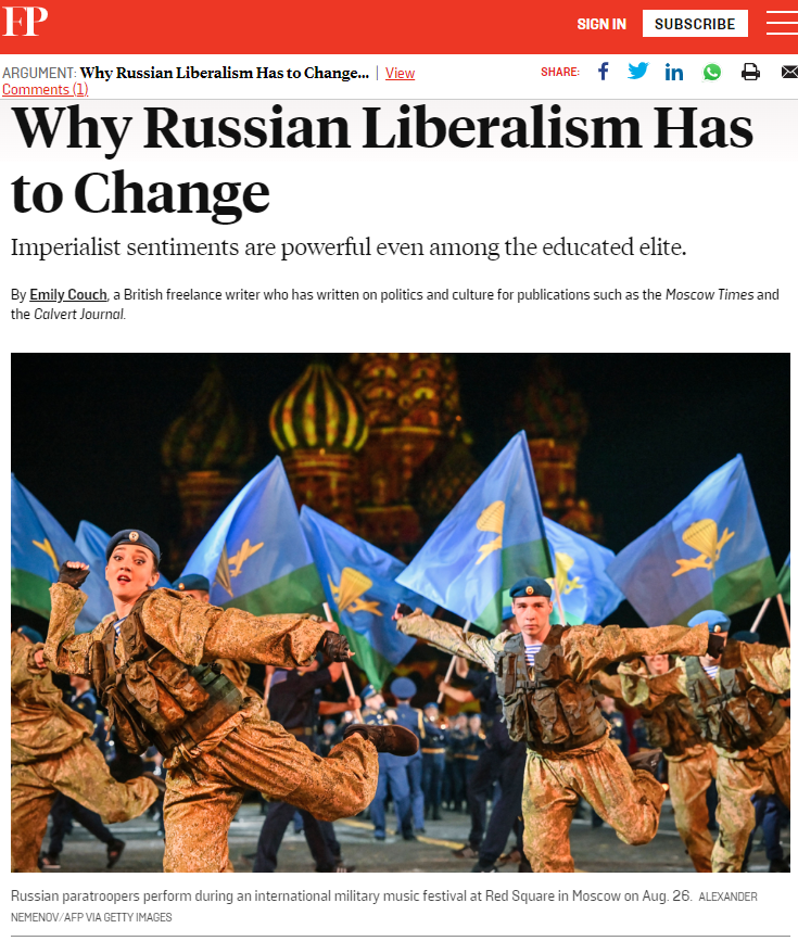 https://racurs.ua/ua/n174265-rosiyski-liberaly-pidtrymuut-imperski-apetyty-kremlya-foreign-policy.htmlРакурсРосійські ліберали, попри критику дій режиму воєнного злочинця росії володимира путіна, підтримують імперські апетити кремля. Таку думку висловила британська письменниця та експерт з політики й культури Емілі Кауч в есеї для Foreign Policy.