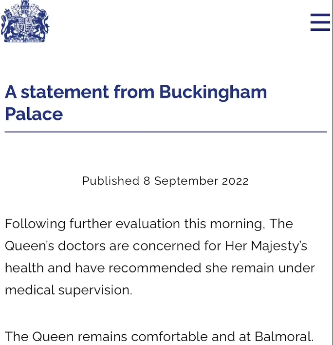 Королева напередодні відклала засідання Таємної ради після того, як лікарі порадили їй відпочити. У вівторок вона зустрілася з прем'єр-міністром Борисом Джонсоном, який залишав свою посаду, перш ніж призначити нового прем'єра Ліз Трасс у Балморалі. Вперше за своє правління вона призначала главу уряду не в Букінгемському палаці.