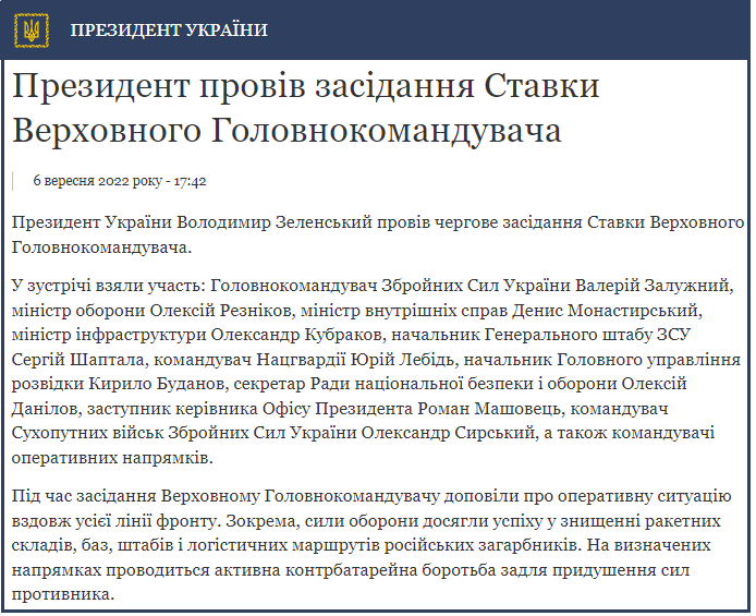 Загалом у сьогоднішньому засіданні Ставки головнокомандувача взяли участь: