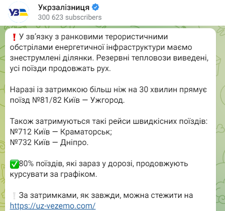 У зв’язку з ранковими терористичними обстрілами енергетичної інфраструктури маємо знеструмлені ділянки. Резервні тепловози виведені, усі поїзди продовжать рух… 80% поїздів, які зараз у дорозі, продовжують курсувати за графіком, — вказала прес-служба «Укрзалізниці» 31 жовтня у Телеграм-повідомленні.